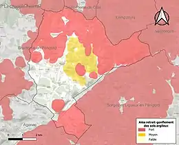 Les mouvements de terrains susceptibles de se produire sur la commune sont des tassements différentiels[39]. Le retrait-gonflement des sols argileux est susceptible d'engendrer des dommages importants aux bâtiments en cas d’alternance de périodes de sécheresse et de pluie[40]. 71,7 % de la superficie communale est en aléa moyen ou fort (58,6 % au niveau départemental et 48,5 % au niveau national métropolitain)[Carte 4]. Depuis le , en application de la loi ÉLAN, différentes contraintes s'imposent aux vendeurs, maîtres d'ouvrages ou constructeurs de biens situés dans une zone classée en aléa moyen ou fort[Note 5],[41].