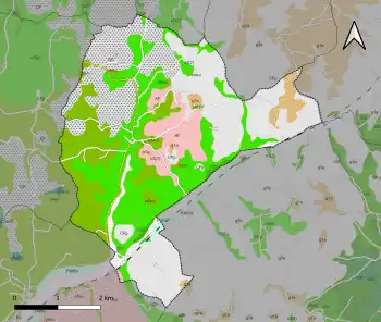 L'occupation des sols de la commune, telle qu'elle ressort de la base de données européenne d’occupation biophysique des sols Corine Land Cover (CLC), est marquée par l'importance des forêts et milieux semi-naturels (50,6 % en 2018), une proportion identique à celle de 1990 (50,9 %). La répartition détaillée en 2018 est la suivante : forêts (50,6 %), zones agricoles hétérogènes (31,5 %), terres arables (16,3 %), prairies (1,5 %)[30]. L'évolution de l’occupation des sols de la commune et de ses infrastructures peut être observée sur les différentes représentations cartographiques du territoire : la carte de Cassini (XVIIIe siècle), la carte d'état-major (1820-1866) et les cartes ou photos aériennes de l'IGN pour la période actuelle (1950 à aujourd'hui)[Carte 3].