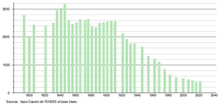 L'évolution du nombre d'habitants est connue à travers les recensements de la population effectués dans la commune depuis 1793. Pour les communes de moins de 10 000 habitants, une enquête de recensement portant sur toute la population est réalisée tous les cinq ans, les populations légales des années intermédiaires étant quant à elles estimées par interpolation ou extrapolation[42]. Pour la commune, le premier recensement exhaustif entrant dans le cadre du nouveau dispositif a été réalisé en 2006[43].