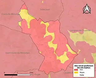 Le retrait-gonflement des sols argileux est susceptible d'engendrer des dommages importants aux bâtiments en cas d’alternance de périodes de sécheresse et de pluie[18]. La totalité de la commune est en aléa moyen ou fort (91,8 % au niveau départemental et 48,5 % au niveau national)[Carte 2]. Depuis le , en application de la loi ELAN, différentes contraintes s'imposent aux vendeurs, maîtres d'ouvrages ou constructeurs de biens situés dans une zone classée en aléa moyen ou fort[Note 3],[19].