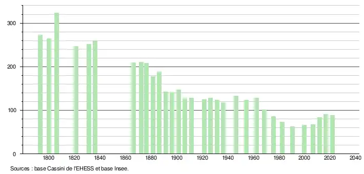 L'évolution du nombre d'habitants est connue à travers les recensements de la population effectués dans la commune depuis 1793. Pour les communes de moins de 10 000 habitants, une enquête de recensement portant sur toute la population est réalisée tous les cinq ans, les populations légales des années intermédiaires étant quant à elles estimées par interpolation ou extrapolation[25]. Pour la commune, le premier recensement exhaustif entrant dans le cadre du nouveau dispositif a été réalisé en 2006[26].