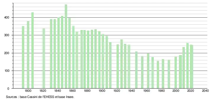 L'évolution du nombre d'habitants est connue à travers les recensements de la population effectués dans la commune depuis 1793. Pour les communes de moins de 10 000 habitants, une enquête de recensement portant sur toute la population est réalisée tous les cinq ans, les populations légales des années intermédiaires étant quant à elles estimées par interpolation ou extrapolation[17]. Pour la commune, le premier recensement exhaustif entrant dans le cadre du nouveau dispositif a été réalisé en 2005[18].