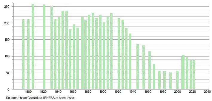 L'évolution du nombre d'habitants est connue à travers les recensements de la population effectués dans la commune depuis 1793. Pour les communes de moins de 10 000 habitants, une enquête de recensement portant sur toute la population est réalisée tous les cinq ans, les populations légales des années intermédiaires étant quant à elles estimées par interpolation ou extrapolation[20]. Pour la commune, le premier recensement exhaustif entrant dans le cadre du nouveau dispositif a été réalisé en 2007[21].