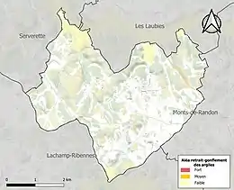 Le retrait-gonflement des sols argileux est susceptible d'engendrer des dommages importants aux bâtiments en cas d’alternance de périodes de sécheresse et de pluie. Aucune partie du territoire de la commune n'est en aléa moyen ou fort (15,8 % au niveau départemental et 48,5 % au niveau national). Sur les 72 bâtiments dénombrés sur la commune en 2019, aucun n'est en aléa moyen ou fort, à comparer aux 14 % au niveau départemental et 54 % au niveau national. Une cartographie de l'exposition du territoire national au retrait gonflement des sols argileux est disponible sur le site du BRGM[17],[Carte 2].