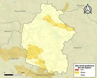 Le retrait-gonflement des sols argileux est susceptible d'engendrer des dommages importants aux bâtiments en cas d’alternance de périodes de sécheresse et de pluie. 16,1 % de la superficie communale est en aléa moyen ou fort (19,2 % au niveau départemental et 48,5 % au niveau national). Sur les 226 bâtiments dénombrés sur la commune en 2019, 18 sont en aléa moyen ou fort, soit 8 %, à comparer aux 17 % au niveau départemental et 54 % au niveau national. Une cartographie de l'exposition du territoire national au retrait gonflement des sols argileux est disponible sur le site du BRGM[20],[Carte 2].