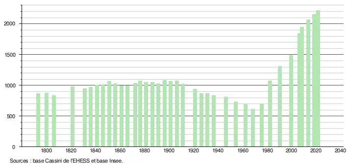 L'évolution du nombre d'habitants est connue à travers les recensements de la population effectués dans la commune depuis 1793. Pour les communes de moins de 10 000 habitants, une enquête de recensement portant sur toute la population est réalisée tous les cinq ans, les populations légales des années intermédiaires étant quant à elles estimées par interpolation ou extrapolation[20]. Pour la commune, le premier recensement exhaustif entrant dans le cadre du nouveau dispositif a été réalisé en 2008[21].