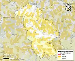 Le retrait-gonflement des sols argileux est susceptible d'engendrer des dommages importants aux bâtiments en cas d’alternance de périodes de sécheresse et de pluie[16]. 51,6 % de la superficie communale est en aléa moyen ou fort (27 % au niveau départemental et 48,5 % au niveau national métropolitain)[Carte 2]. Depuis le , en application de la loi ÉLAN, différentes contraintes s'imposent aux vendeurs, maîtres d'ouvrages ou constructeurs de biens situés dans une zone classée en aléa moyen ou fort[Note 3],[17].