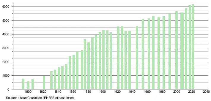 L'évolution du nombre d'habitants est connue à travers les recensements de la population effectués dans la commune depuis 1793. Pour les communes de moins de 10 000 habitants, une enquête de recensement portant sur toute la population est réalisée tous les cinq ans, les populations légales des années intermédiaires étant quant à elles estimées par interpolation ou extrapolation[26]. Pour la commune, le premier recensement exhaustif entrant dans le cadre du nouveau dispositif a été réalisé en 2007[27].