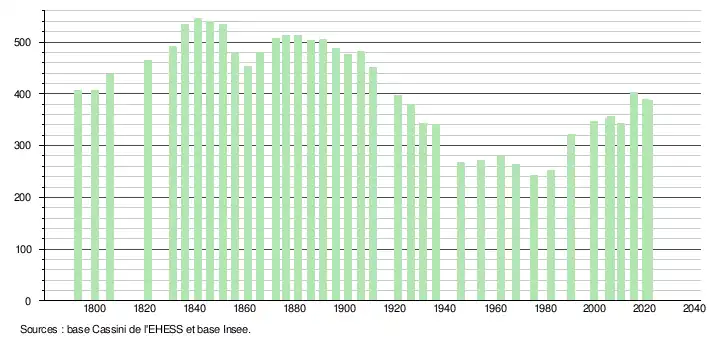 L'évolution du nombre d'habitants est connue à travers les recensements de la population effectués dans la commune depuis 1793. Pour les communes de moins de 10 000 habitants, une enquête de recensement portant sur toute la population est réalisée tous les cinq ans, les populations légales des années intermédiaires étant quant à elles estimées par interpolation ou extrapolation[24]. Pour la commune, le premier recensement exhaustif entrant dans le cadre du nouveau dispositif a été réalisé en 2005[25].
