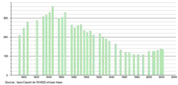 L'évolution du nombre d'habitants est connue à travers les recensements de la population effectués dans la commune depuis 1793. Pour les communes de moins de 10 000 habitants, une enquête de recensement portant sur toute la population est réalisée tous les cinq ans, les populations légales des années intermédiaires étant quant à elles estimées par interpolation ou extrapolation[25]. Pour la commune, le premier recensement exhaustif entrant dans le cadre du nouveau dispositif a été réalisé en 2008[26].