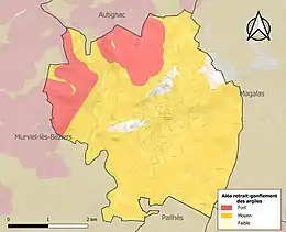 Le retrait-gonflement des sols argileux est susceptible d'engendrer des dommages importants aux bâtiments en cas d’alternance de périodes de sécheresse et de pluie. 96,1 % de la superficie communale est en aléa moyen ou fort (59,3 % au niveau départemental et 48,5 % au niveau national). Sur les 863 bâtiments dénombrés sur la commune en 2019, 829 sont en aléa moyen ou fort, soit 96 %, à comparer aux 85 % au niveau départemental et 54 % au niveau national. Une cartographie de l'exposition du territoire national au retrait gonflement des sols argileux est disponible sur le site du BRGM[17],[Carte 2].