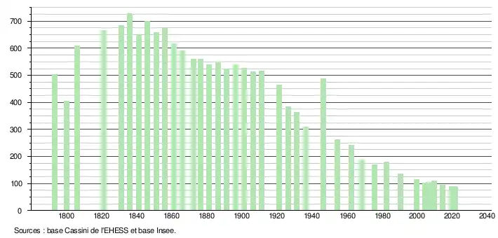 L'évolution du nombre d'habitants est connue à travers les recensements de la population effectués dans la commune depuis 1793. Pour les communes de moins de 10 000 habitants, une enquête de recensement portant sur toute la population est réalisée tous les cinq ans, les populations légales des années intermédiaires étant quant à elles estimées par interpolation ou extrapolation[22]. Pour la commune, le premier recensement exhaustif entrant dans le cadre du nouveau dispositif a été réalisé en 2004[23].