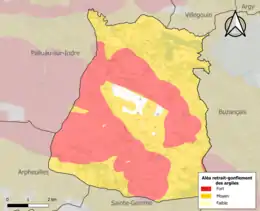Le retrait-gonflement des sols argileux est susceptible d'engendrer des dommages importants aux bâtiments en cas d’alternance de périodes de sécheresse et de pluie. 97,5 % de la superficie communale est en aléa moyen ou fort (84,7 % au niveau départemental et 48,5 % au niveau national). Sur les 574 bâtiments dénombrés sur la commune en 2019, 564 sont en aléa moyen ou fort, soit 98 %, à comparer aux 86 % au niveau départemental et 54 % au niveau national. Une cartographie de l'exposition du territoire national au retrait gonflement des sols argileux est disponible sur le site du BRGM[23],[24].