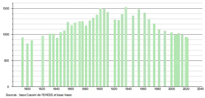 L'évolution du nombre d'habitants est connue à travers les recensements de la population effectués dans la commune depuis 1793. Pour les communes de moins de 10 000 habitants, une enquête de recensement portant sur toute la population est réalisée tous les cinq ans, les populations légales des années intermédiaires étant quant à elles estimées par interpolation ou extrapolation[32]. Pour la commune, le premier recensement exhaustif entrant dans le cadre du nouveau dispositif a été réalisé en 2004[33].