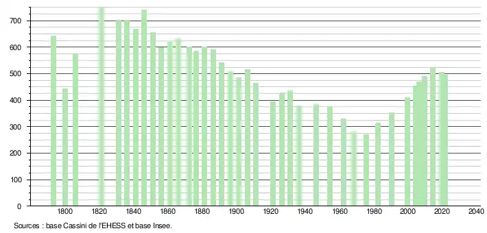 L'évolution du nombre d'habitants est connue à travers les recensements de la population effectués dans la commune depuis 1793. Pour les communes de moins de 10 000 habitants, une enquête de recensement portant sur toute la population est réalisée tous les cinq ans, les populations légales des années intermédiaires étant quant à elles estimées par interpolation ou extrapolation[29]. Pour la commune, le premier recensement exhaustif entrant dans le cadre du nouveau dispositif a été réalisé en 2004[30].