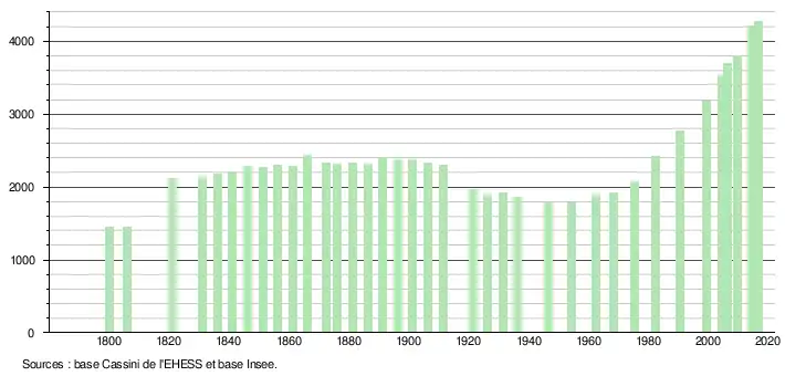 L'évolution du nombre d'habitants est connue à travers les recensements de la population effectués dans la commune depuis 1800. Pour les communes de moins de 10 000 habitants, une enquête de recensement portant sur toute la population est réalisée tous les cinq ans, les populations légales des années intermédiaires étant quant à elles estimées par interpolation ou extrapolation[14]. Pour la commune, le premier recensement exhaustif entrant dans le cadre du nouveau dispositif a été réalisé en 2004[15].
