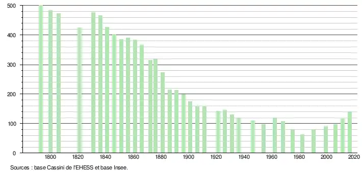 L'évolution du nombre d'habitants est connue à travers les recensements de la population effectués dans la commune depuis 1793. Pour les communes de moins de 10 000 habitants, une enquête de recensement portant sur toute la population est réalisée tous les cinq ans, les populations légales des années intermédiaires étant quant à elles estimées par interpolation ou extrapolation[10]. Pour la commune, le premier recensement exhaustif entrant dans le cadre du nouveau dispositif a été réalisé en 2006[11].
