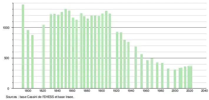 L'évolution du nombre d'habitants est connue à travers les recensements de la population effectués dans la commune depuis 1793. Pour les communes de moins de 10 000 habitants, une enquête de recensement portant sur toute la population est réalisée tous les cinq ans, les populations légales des années intermédiaires étant quant à elles estimées par interpolation ou extrapolation[20]. Pour la commune, le premier recensement exhaustif entrant dans le cadre du nouveau dispositif a été réalisé en 2008[21].