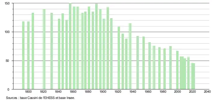 L'évolution du nombre d'habitants est connue à travers les recensements de la population effectués dans la commune depuis 1793. Pour les communes de moins de 10 000 habitants, une enquête de recensement portant sur toute la population est réalisée tous les cinq ans, les populations légales des années intermédiaires étant quant à elles estimées par interpolation ou extrapolation[26]. Pour la commune, le premier recensement exhaustif entrant dans le cadre du nouveau dispositif a été réalisé en 2004[27].