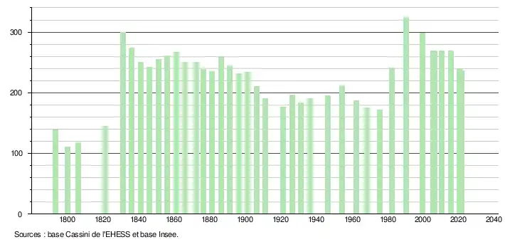 L'évolution du nombre d'habitants est connue à travers les recensements de la population effectués dans la commune depuis 1793. Pour les communes de moins de 10 000 habitants, une enquête de recensement portant sur toute la population est réalisée tous les cinq ans, les populations légales des années intermédiaires étant quant à elles estimées par interpolation ou extrapolation[21]. Pour la commune, le premier recensement exhaustif entrant dans le cadre du nouveau dispositif a été réalisé en 2005[22].