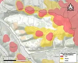 Les mouvements de terrains susceptibles de se produire sur la commune sont des tassements différentiels[36]. Le retrait-gonflement des sols argileux est susceptible d'engendrer des dommages importants aux bâtiments en cas d’alternance de périodes de sécheresse et de pluie[37]. 40,6 % de la superficie communale est en aléa moyen ou fort (58,6 % au niveau départemental et 48,5 % au niveau national métropolitain)[Carte 4]. Depuis le , en application de la loi ÉLAN, différentes contraintes s'imposent aux vendeurs, maîtres d'ouvrages ou constructeurs de biens situés dans une zone classée en aléa moyen ou fort[Note 4],[38].