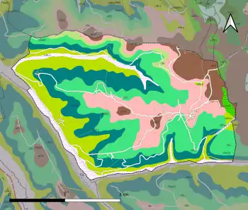 L'occupation des sols de la commune, telle qu'elle ressort de la base de données européenne d’occupation biophysique des sols Corine Land Cover (CLC), est marquée par l'importance des territoires agricoles (53,3 % en 2018), néanmoins en diminution par rapport à 1990 (58,5 %). La répartition détaillée en 2018 est la suivante : zones agricoles hétérogènes (40,1 %), forêts (33,4 %), milieux à végétation arbustive et/ou herbacée (13,3 %), prairies (13,2 %)[30]. L'évolution de l’occupation des sols de la commune et de ses infrastructures peut être observée sur les différentes représentations cartographiques du territoire : la carte de Cassini (XVIIIe siècle), la carte d'état-major (1820-1866) et les cartes ou photos aériennes de l'IGN pour la période actuelle (1950 à aujourd'hui)[Carte 3].