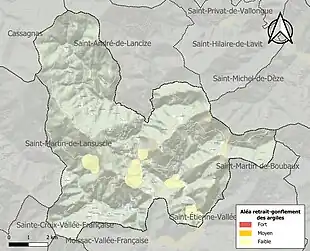 Le retrait-gonflement des sols argileux est susceptible d'engendrer des dommages importants aux bâtiments en cas d’alternance de périodes de sécheresse et de pluie. Aucune partie du territoire de la commune n'est en aléa moyen ou fort (15,8 % au niveau départemental et 48,5 % au niveau national). Sur les 418 bâtiments dénombrés sur la commune en 2019, aucun n'est en aléa moyen ou fort, à comparer aux 14 % au niveau départemental et 54 % au niveau national. Une cartographie de l'exposition du territoire national au retrait gonflement des sols argileux est disponible sur le site du BRGM[27],[Carte 2].