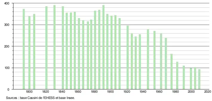 L'évolution du nombre d'habitants est connue à travers les recensements de la population effectués dans la commune depuis 1793. À partir du , les populations légales des communes sont publiées annuellement dans le cadre d'un recensement qui repose désormais sur une collecte d'information annuelle, concernant successivement tous les territoires communaux au cours d'une période de cinq ans. Pour les communes de moins de 10 000 habitants, une enquête de recensement portant sur toute la population est réalisée tous les cinq ans, les populations légales des années intermédiaires étant quant à elles estimées par interpolation ou extrapolation[17]. Pour la commune, le premier recensement exhaustif entrant dans le cadre du nouveau dispositif a été réalisé en 2004[18],[Note 2].