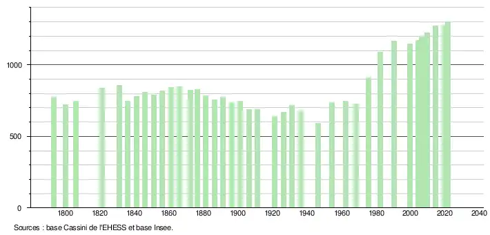 L'évolution du nombre d'habitants est connue à travers les recensements de la population effectués dans la commune depuis 1793. Pour les communes de moins de 10 000 habitants, une enquête de recensement portant sur toute la population est réalisée tous les cinq ans, les populations légales des années intermédiaires étant quant à elles estimées par interpolation ou extrapolation[20]. Pour la commune, le premier recensement exhaustif entrant dans le cadre du nouveau dispositif a été réalisé en 2004[21].