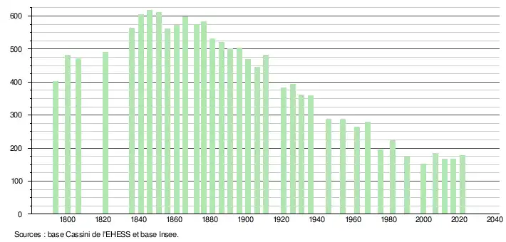 L'évolution du nombre d'habitants est connue à travers les recensements de la population effectués dans la commune depuis 1793. Pour les communes de moins de 10 000 habitants, une enquête de recensement portant sur toute la population est réalisée tous les cinq ans, les populations légales des années intermédiaires étant quant à elles estimées par interpolation ou extrapolation[14]. Pour la commune, le premier recensement exhaustif entrant dans le cadre du nouveau dispositif a été réalisé en 2006[15].
