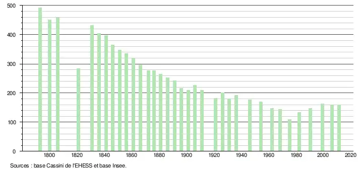 - Dans le tableau des recensements et le graphique, par convention dans Wikipédia, le principe a été retenu, pour les populations légales postérieures à 1999 de n’afficher dans le tableau des recensements et le graphique que les populations correspondant à l'année 2006, première population légale publiée calculée conformément aux concepts définis dans le décret no 2003-485 du 5 juin 2003, et les années correspondant à une enquête exhaustive de recensement pour les communes de moins de 10 000 habitants, ainsi que la dernière population légale publiée par l’Insee.