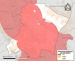 Le retrait-gonflement des sols argileux est susceptible d'engendrer des dommages importants aux bâtiments en cas d’alternance de périodes de sécheresse et de pluie. 74,8 % de la superficie communale est en aléa moyen ou fort (54,2 % au niveau départemental et 48,5 % au niveau national). Sur les 118 bâtiments dénombrés sur la commune en 2019, 116 sont en aléa moyen ou fort, soit 98 %, à comparer aux 57 % au niveau départemental et 54 % au niveau national. Une cartographie de l'exposition du territoire national au retrait gonflement des sols argileux est disponible sur le site du BRGM[12],[Carte 2].