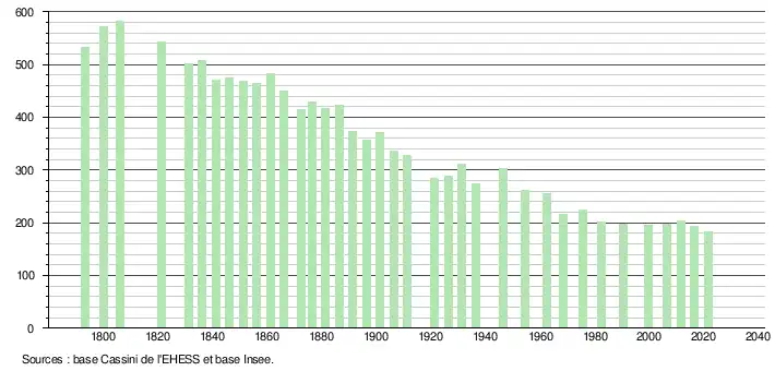 L'évolution du nombre d'habitants est connue à travers les recensements de la population effectués dans la commune depuis 1793. Pour les communes de moins de 10 000 habitants, une enquête de recensement portant sur toute la population est réalisée tous les cinq ans, les populations légales des années intermédiaires étant quant à elles estimées par interpolation ou extrapolation[17]. Pour la commune, le premier recensement exhaustif entrant dans le cadre du nouveau dispositif a été réalisé en 2006[18].