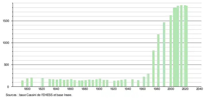 L'évolution du nombre d'habitants est connue à travers les recensements de la population effectués dans la commune depuis 1793. Pour les communes de moins de 10 000 habitants, une enquête de recensement portant sur toute la population est réalisée tous les cinq ans, les populations légales des années intermédiaires étant quant à elles estimées par interpolation ou extrapolation[21]. Pour la commune, le premier recensement exhaustif entrant dans le cadre du nouveau dispositif a été réalisé en 2004[22].