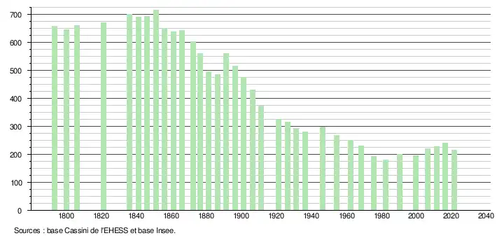 L'évolution du nombre d'habitants est connue à travers les recensements de la population effectués dans la commune depuis 1793. Pour les communes de moins de 10 000 habitants, une enquête de recensement portant sur toute la population est réalisée tous les cinq ans, les populations légales des années intermédiaires étant quant à elles estimées par interpolation ou extrapolation[18]. Pour la commune, le premier recensement exhaustif entrant dans le cadre du nouveau dispositif a été réalisé en 2006[19].