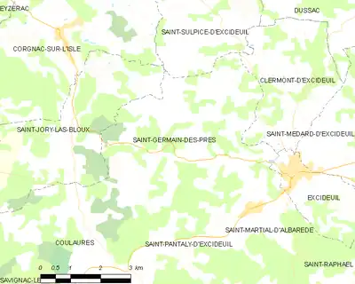 Saint-Germain-des-Prés est limitrophe de six autres communes. Au nord, son territoire est distant d'environ 150 mètres de celui de Corgnac-sur-l'Isle.