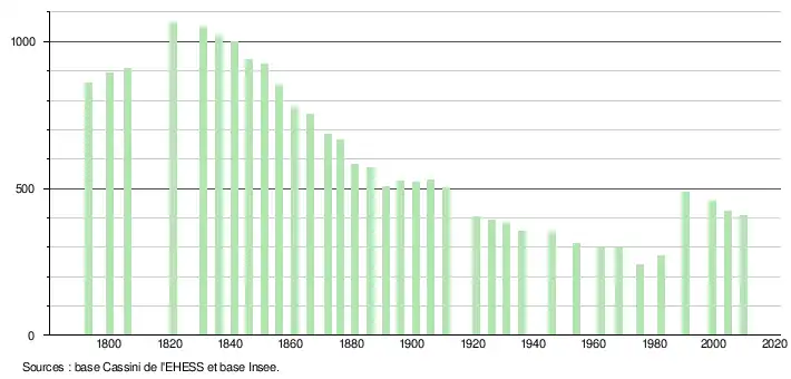 L'évolution du nombre d'habitants est connue à travers les recensements de la population effectués dans la commune depuis 1793. À partir du , les populations légales des communes sont publiées annuellement dans le cadre d'un recensement qui repose désormais sur une collecte d'information annuelle, concernant successivement tous les territoires communaux au cours d'une période de cinq ans. Pour les communes de moins de 10 000 habitants, une enquête de recensement portant sur toute la population est réalisée tous les cinq ans, les populations légales des années intermédiaires étant quant à elles estimées par interpolation ou extrapolation[8]. Pour la commune, le premier recensement exhaustif entrant dans le cadre du nouveau dispositif a été réalisé en 2004[9],[Note 2].