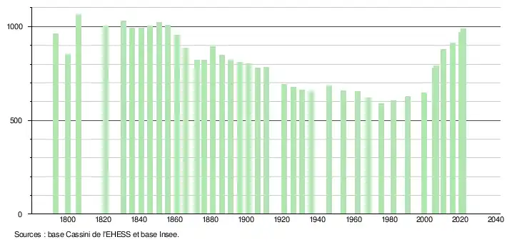 L'évolution du nombre d'habitants est connue à travers les recensements de la population effectués dans la commune depuis 1793. Pour les communes de moins de 10 000 habitants, une enquête de recensement portant sur toute la population est réalisée tous les cinq ans, les populations légales des années intermédiaires étant quant à elles estimées par interpolation ou extrapolation[22]. Pour la commune, le premier recensement exhaustif entrant dans le cadre du nouveau dispositif a été réalisé en 2005[23].