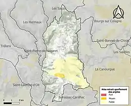 Le retrait-gonflement des sols argileux est susceptible d'engendrer des dommages importants aux bâtiments en cas d’alternance de périodes de sécheresse et de pluie. 1,4 % de la superficie communale est en aléa moyen ou fort (15,8 % au niveau départemental et 48,5 % au niveau national). Sur les 460 bâtiments dénombrés sur la commune en 2019, aucun n'est en aléa moyen ou fort, à comparer aux 14 % au niveau départemental et 54 % au niveau national. Une cartographie de l'exposition du territoire national au retrait gonflement des sols argileux est disponible sur le site du BRGM[27],[Carte 2].