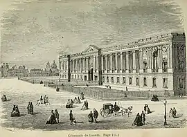 Le quartier est en grande partie récent à l'époque. Les immeubles qui empêchaient la vue complète depuis la colonnade sur l'église sont démolis et remplacés par la place du Louvre[4] et la rue du même nom[5]en 1853. Des immeubles sont construits au sud de la place. À l'est, c'est le tour de la mairie du 1er arrondissement, créée pour être le pendant architectural de l'église, avec, entre les deux édifices, son beffroi. Celui-ci est particulièrement critiqué, notamment par Décembre-Alonnier[1]. L'église Saint-Germain-l'Auxerrois vient de bénéficier d'un ravalement extérieur complet afin de créer une harmonie pour le nouvel ensemble[1].
