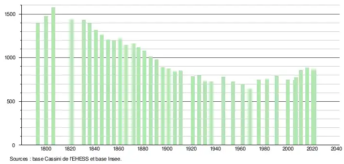L'évolution du nombre d'habitants est connue à travers les recensements de la population effectués dans la commune depuis 1793. Pour les communes de moins de 10 000 habitants, une enquête de recensement portant sur toute la population est réalisée tous les cinq ans, les populations légales des années intermédiaires étant quant à elles estimées par interpolation ou extrapolation[26]. Pour la commune, le premier recensement exhaustif entrant dans le cadre du nouveau dispositif a été réalisé en 2005[27].
