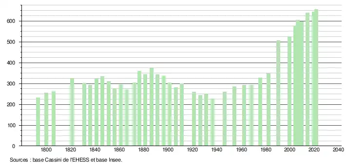L'évolution du nombre d'habitants est connue à travers les recensements de la population effectués dans la commune depuis 1793. Pour les communes de moins de 10 000 habitants, une enquête de recensement portant sur toute la population est réalisée tous les cinq ans, les populations légales des années intermédiaires étant quant à elles estimées par interpolation ou extrapolation[17]. Pour la commune, le premier recensement exhaustif entrant dans le cadre du nouveau dispositif a été réalisé en 2004[18].