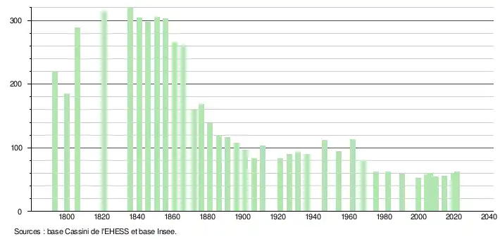 L'évolution du nombre d'habitants est connue à travers les recensements de la population effectués dans la commune depuis 1793. Pour les communes de moins de 10 000 habitants, une enquête de recensement portant sur toute la population est réalisée tous les cinq ans, les populations légales des années intermédiaires étant quant à elles estimées par interpolation ou extrapolation[21]. Pour la commune, le premier recensement exhaustif entrant dans le cadre du nouveau dispositif a été réalisé en 2004[22].