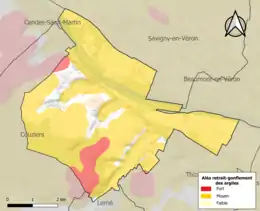 La commune est vulnérable au risque de mouvements de terrains constitué principalement du retrait-gonflement des sols argileux[24]. Cet aléa est susceptible d'engendrer des dommages importants aux bâtiments en cas d’alternance de périodes de sécheresse et de pluie. 89,5 % de la superficie communale est en aléa moyen ou fort (90,2 % au niveau départemental et 48,5 % au niveau national). Sur les 275 bâtiments dénombrés sur la commune en 2019, 229 sont en aléa moyen ou fort, soit 83 %, à comparer aux 91 % au niveau départemental et 54 % au niveau national. Une cartographie de l'exposition du territoire national au retrait gonflement des sols argileux est disponible sur le site du BRGM[25],[26].
