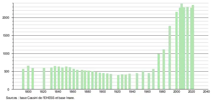 L'évolution du nombre d'habitants est connue à travers les recensements de la population effectués dans la commune depuis 1793. Pour les communes de moins de 10 000 habitants, une enquête de recensement portant sur toute la population est réalisée tous les cinq ans, les populations légales des années intermédiaires étant quant à elles estimées par interpolation ou extrapolation[21]. Pour la commune, le premier recensement exhaustif entrant dans le cadre du nouveau dispositif a été réalisé en 2004[22].