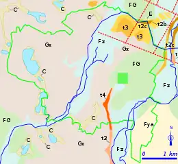 Le territoire communal repose sur le bassin houiller stéphanien sous-vosgien, daté entre -307 et -299 millions d'années[8], ces formations carbonifères sont noyées sous 200 à 1 000 m de sédiments du Permien[B 1]. Les strates triasiques qui les recouvrent immédiatement n'affleurent que très localement, sous forme de grès (t2b), de grès à Voltzia (t2c) et de marnes (t3 et t4), au bord du talus des terrasses à la faveur d'un réseau de failles, ou des vallées des cours d'eau. Plus tard, l'histoire géomorphologique de Saint-Germain est fortement marquée par la glaciation de Riss dont les glaciers, à leur avancée maximale, atteignent la région du plateau des Mille étangs. Les dépôts glaciaires et les moraines sont variés et d'une grande épaisseur. Les dépôts des moraines (Gx) cèdent la place aux cônes de transition constitués par les alluvions charriés par les cours d'eau issus de la fonte des glaciers (FG). Les terrasses alluviales (Fya) n'affleurent qu'au sud-est de la commune. Tout ce système est recoupé par les vallées récentes des cours d'eau recouvertes d'alluvions (Fz) et dont les flancs abrupts sont propices à la présence d'éboulis (E) et de colluvions (C)[9].