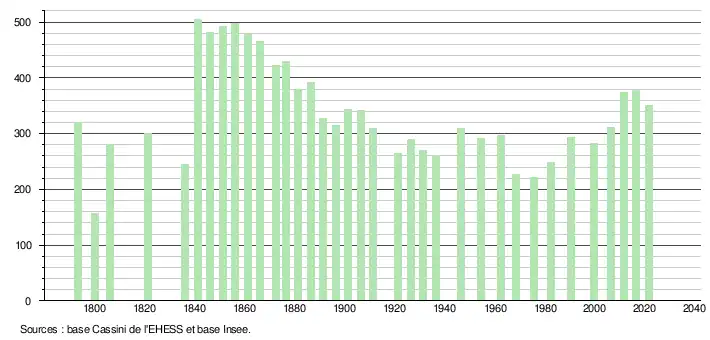 L'évolution du nombre d'habitants est connue à travers les recensements de la population effectués dans la commune depuis 1793. Pour les communes de moins de 10 000 habitants, une enquête de recensement portant sur toute la population est réalisée tous les cinq ans, les populations légales des années intermédiaires étant quant à elles estimées par interpolation ou extrapolation[20]. Pour la commune, le premier recensement exhaustif entrant dans le cadre du nouveau dispositif a été réalisé en 2006[21].