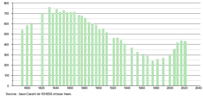L'évolution du nombre d'habitants est connue à travers les recensements de la population effectués dans la commune depuis 1793. Pour les communes de moins de 10 000 habitants, une enquête de recensement portant sur toute la population est réalisée tous les cinq ans, les populations légales des années intermédiaires étant quant à elles estimées par interpolation ou extrapolation[14]. Pour la commune, le premier recensement exhaustif entrant dans le cadre du nouveau dispositif a été réalisé en 2005[15].