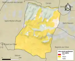 Le retrait-gonflement des sols argileux est susceptible d'engendrer des dommages importants aux bâtiments en cas d’alternance de périodes de sécheresse et de pluie. 67 % de la superficie communale est en aléa moyen ou fort (67,5 % au niveau départemental et 48,5 % au niveau national). Sur les 364 bâtiments dénombrés sur la commune en 2019, 356 sont en aléa moyen ou fort, soit 98 %, à comparer aux 90 % au niveau départemental et 54 % au niveau national. Une cartographie de l'exposition du territoire national au retrait gonflement des sols argileux est disponible sur le site du BRGM[19],[Carte 2].