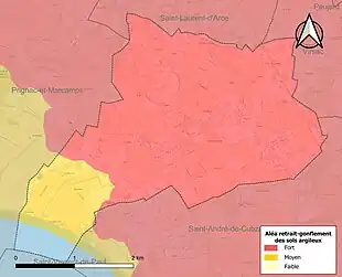 Le retrait-gonflement des sols argileux est susceptible d'engendrer des dommages importants aux bâtiments en cas d’alternance de périodes de sécheresse et de pluie. 96,2 % de la superficie communale est en aléa moyen ou fort (67,4 % au niveau départemental et 48,5 % au niveau national). Sur les 724 bâtiments dénombrés sur la commune en 2019, 724 sont en aléa moyen ou fort, soit 100 %, à comparer aux 84 % au niveau départemental et 54 % au niveau national. Une cartographie de l'exposition du territoire national au retrait gonflement des sols argileux est disponible sur le site du BRGM[30],[Carte 2].